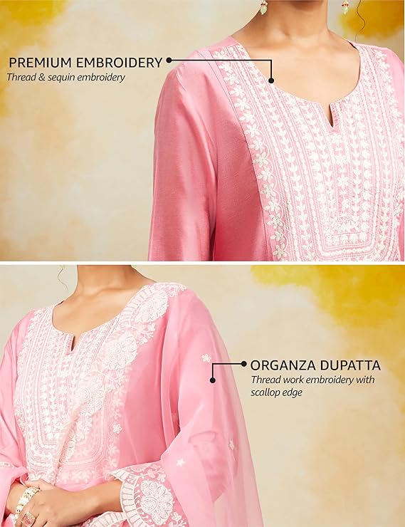 • PRODUCT DETAILS: 3-piece set featuring calf-length A-line kurta with embroidered yoke, 3/4th sleeves, paired with straight-fit pyjama with pocket and organza dupatta finished with scallop edge thread embroidery.